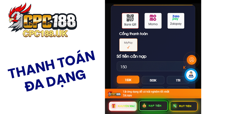 Muốn nạp tiền nhanh hơn nữa, ví điện tử như Momo, ZaloPay, ViettelPay là sự lựa chọn lý tưởng. Quy trình chỉ mất vài giây, bạn quét mã QR hoặc nhập số tiền là hoàn tất. Ngoài ra, CPC188 còn hỗ trợ nạp qua thẻ cào điện thoại của các nhà mạng Viettel, Vinaphone, Mobifone. Mức nạp tối thiểu thường chỉ từ 50.000 VND. Rất phù hợp với người chơi mới muốn thử nghiệm trước khi đầu tư lớn. Tất cả các phương thức này đều không mất phí giao dịch từ phía nhà cái.